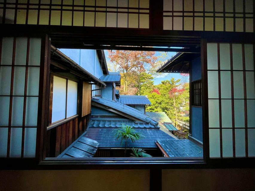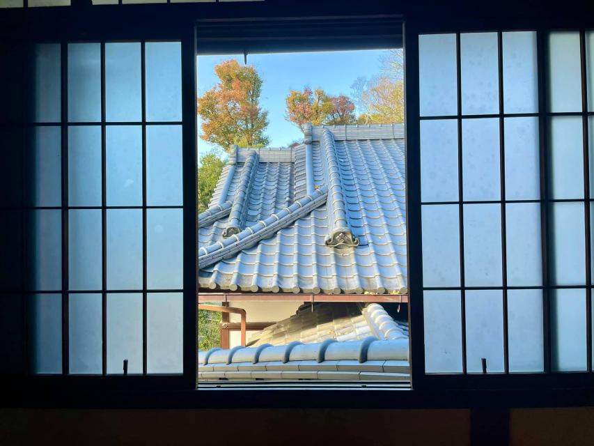 旧三井家下鴨別邸の2階からは、秋色に彩られた美しい庭園を見下ろせます。また、四方ガラス窓の3階望楼からは、東山の眺望をお楽しみいただけます。