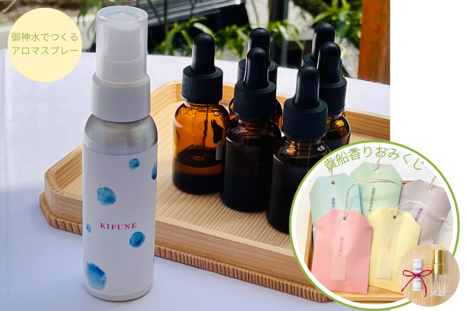 貴船をイメージした香りのミニスプレー。香りとメッセージは開封後のお楽しみ。