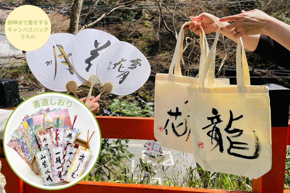〇御神水で墨を擦る「書道体験」うちわ/キャンバスバッグ 各 2000円