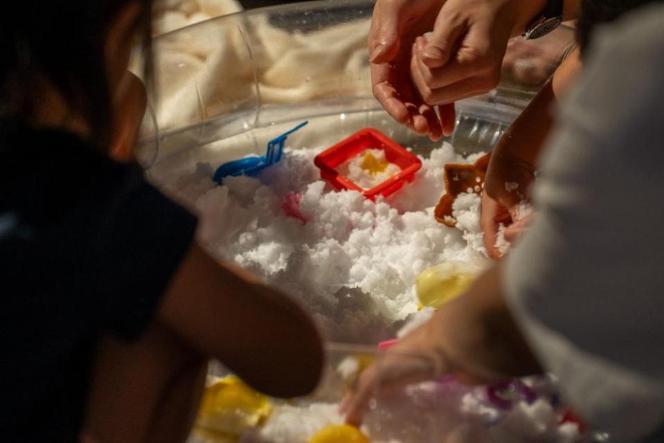 人工雪を使った冷たいエリアで握る、かたちをとるなどをして、ヒヤヒヤを楽しもう!