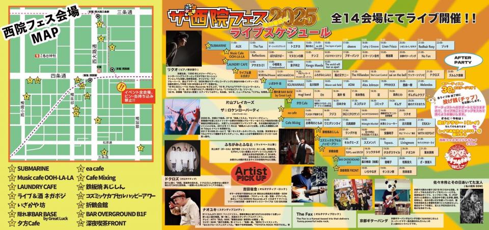 20年以上続く毎年恒例の「西院フェス」が今年も開催。西院周辺の計14カ所を会場に、リクオ、ふちがみとふなと、吉田省念、片山ブレイカーズ&ザ★ロケンローパーティ、ドクロズら90組以上が出演。