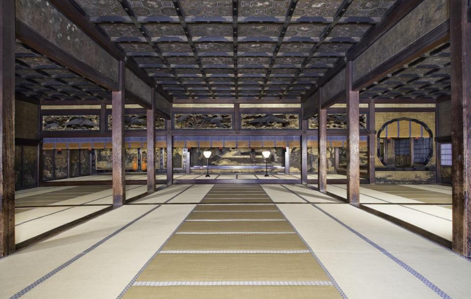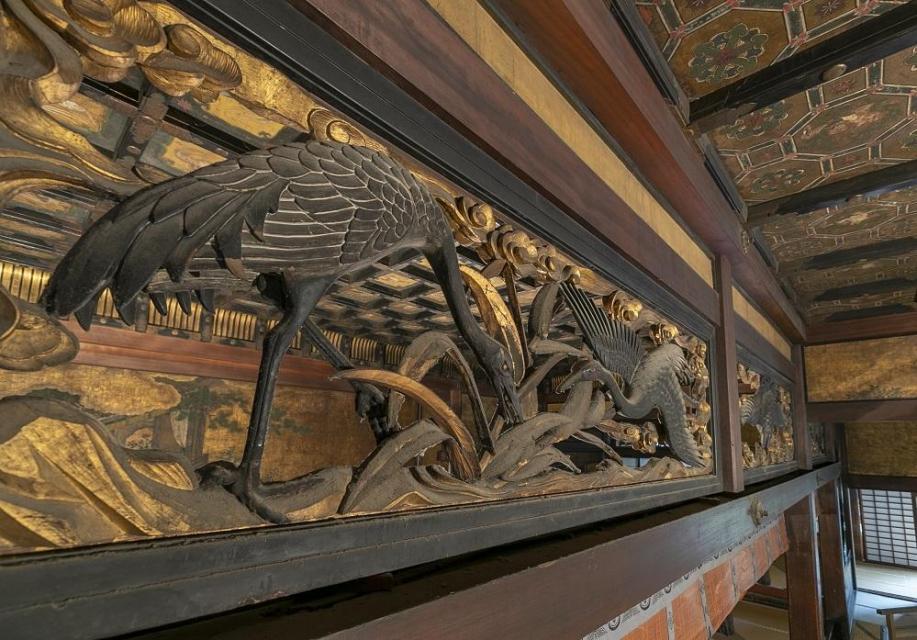 また合わせて、豪壮華麗な書院(国宝)の対面所「鴻の間」や白書院も拝観。室内を飾る狩野派や円山派による金碧障壁画や重厚な彫刻、現存最古の北能舞台(国宝)や「虎渓(こけい)の庭」(特別名勝)もみどころです。