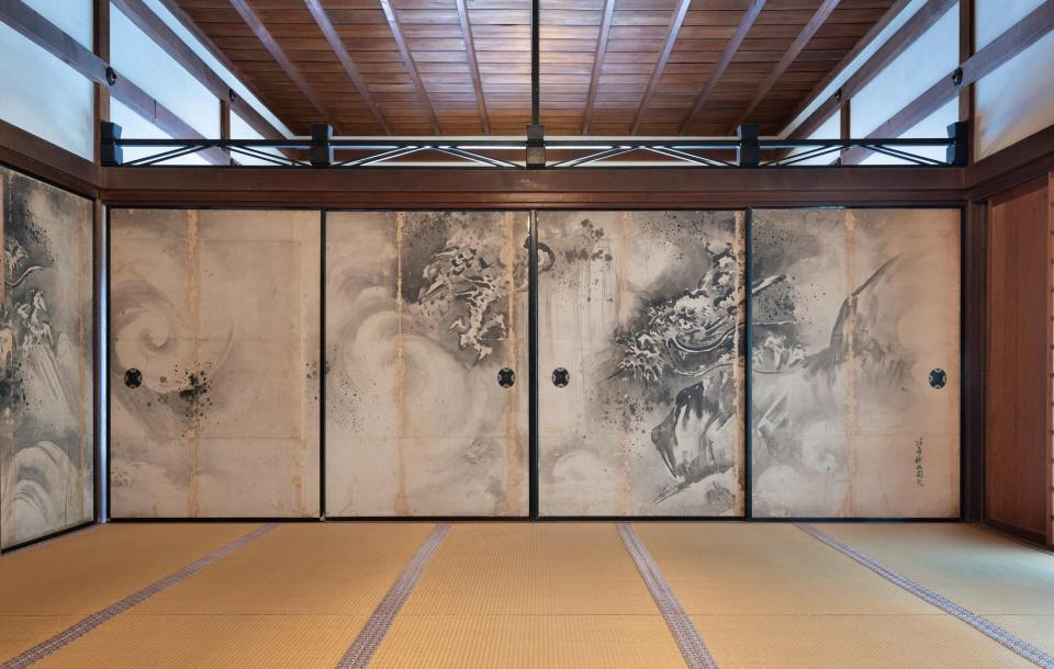大徳寺の塔頭寺院で、豊臣秀吉の弟・秀長の菩提寺として奈良・大和郡山に創建され、後に大徳寺山内に移された。客殿には秀長の木像が安置され、内部を飾る水墨の襖絵は、奥州・伊達家伝来の狩野探幽筆「黒雲龍図(こくうんりゅうず)」屏風を襖に仕立て直したものと伝わる。また「蒲庵(ほあん)」は、黒田如水(官兵衛)好みの二畳台目の茶室。現在の茶室は移築されたものだが、もともとこの茶席についた露地に、如水の子・黒田長政と加藤清正、福島正則の三武将が一つずつ石を寄進したということから「三石の席」とも称される。※個人での拝観は予約不要です。