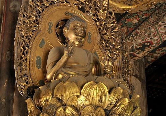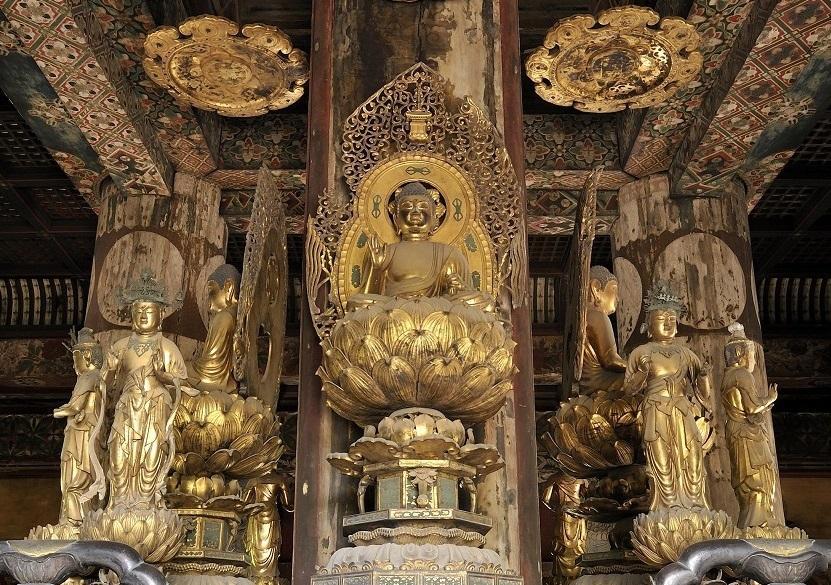 世界遺産に登録された真言宗総本山で、正式名称は「教王護国寺(きょうおうごこくじ)」。平安京造営時に創建され、のちに弘法大師空海に下賜された。江戸時代再建の五重塔(国宝)は、高さ約55mで木造の古塔としては日本一高い。特別公開の初層内部は極彩色の文様で彩られ、大日如来に見立てた心柱を囲んで金剛界四仏が安置されている。また薬師三尊像を祀る金堂(国宝)、21体の仏像が立体曼荼羅を形成する講堂(重文)も拝観できる。五重塔の初層内部に入れます!