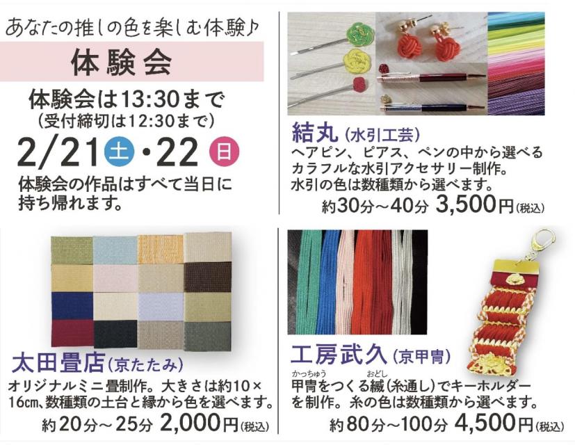 | 2月21・22日(土・日) 結丸(水引工芸) | カラフルな水引アクセサリー制作 約30分~40分 3,500円(税込) ヘアピン、ピアス、ペンの中から選べます。 |