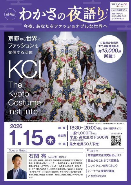 大好評の「わかさの夜語り」、第14回目のゲストは、京都から世界にファッションの展覧会を発信する京都服飾文化研究財団(KCI)のキュレーター 石関亮さんにこれまでのKCIの活動やこれからのファッション展覧会などについてお話いただきます。