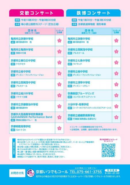 京都さくらパレードは、桜の開花時期に、京都府内の中・高等学校等の吹奏楽部が集い、日頃の練習の成果を発表して相互の研鑽と交流を深める場とするとともに、市民や観光客の皆様に軽快で華やかな吹奏楽の演奏をお楽しみいただくイベントです。今年は、梅小路公園、京都鉄道博物館を会場として開催します。