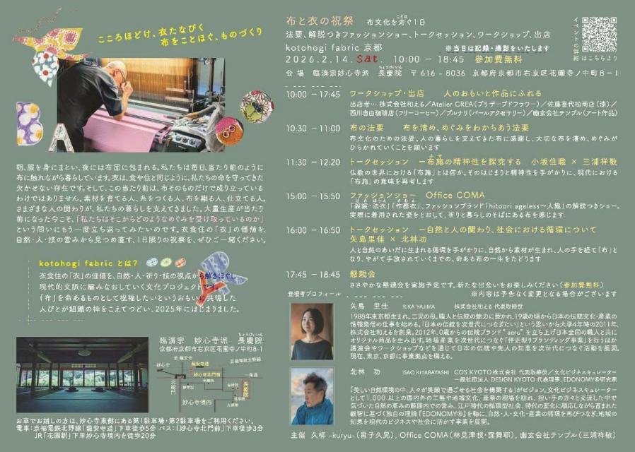 京都・長慶院にて、衣食住の“衣”に宿る恵みを再発見する1DAYイベント『kotohogi fabric』を開催します。法衣・袈裟の世界が培ってきた布づくりと手仕事の技、その背景にある人と時間の価値を、寺院という本来の舞台でひらき直します。対話・展示・ファッションショー・ワークショップを通して、布が生まれ、衣となり、巡っていく営みに触れ、効率や価格だけでは測れない価値を体感する場です。株式会社和える「社長、貸します。」キャンペーン採択により、矢島里佳氏も登壇。マルシェやフリーコーヒー、キッチンカーも予定。入場無料・出入り自由、どなたでも歓迎します。