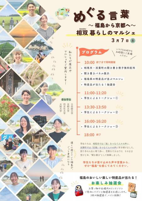福島県・相馬市と双葉町に、関西地域の大学生12名が滞在し、地域の人々の言葉に丁寧に耳を傾け、取材・執筆した「相双ライターインレジデンスプログラム」。そこで生まれた言葉の数々をまとめた冊子 『めぐる言葉』 のお披露目と、福島の産品が並ぶマルシェを京都で開催します。