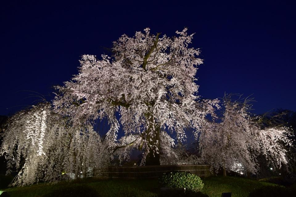 京都随一の桜の名所。公園を象徴する祇園枝垂桜の風格ある姿をライトアップ。この時期、円山公園から高台寺、清水寺への散策も風情がある。中心に位置する「しだれ桜」」は通称「祇園の夜桜」と呼ばれ、正式名は「一重白彼岸枝垂桜(ひとえしろひがんしだれざくら)」という。現在のものは二代目で、桜守として知られる16代目佐野藤右衛門氏により守られている。夜にはライトアップの灯りに照らされ、しっとりとした風情を醸し出す。<京都市観光協会公式 ライブカメラ(3/24~期間限定)>