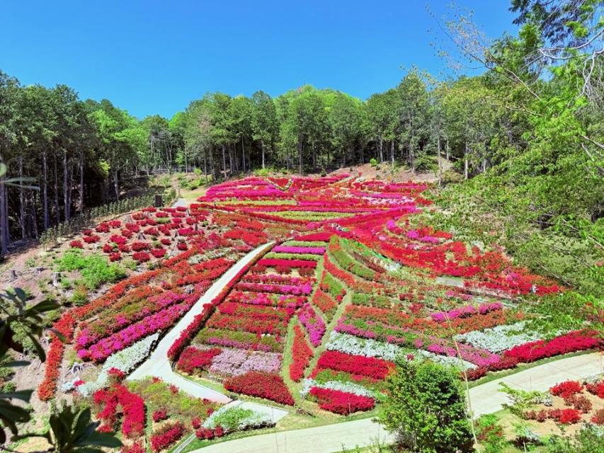 2万株の赤、紫、ピンク、白が山の斜面を覆いつくします。満開時には、見事な景観を呈します。