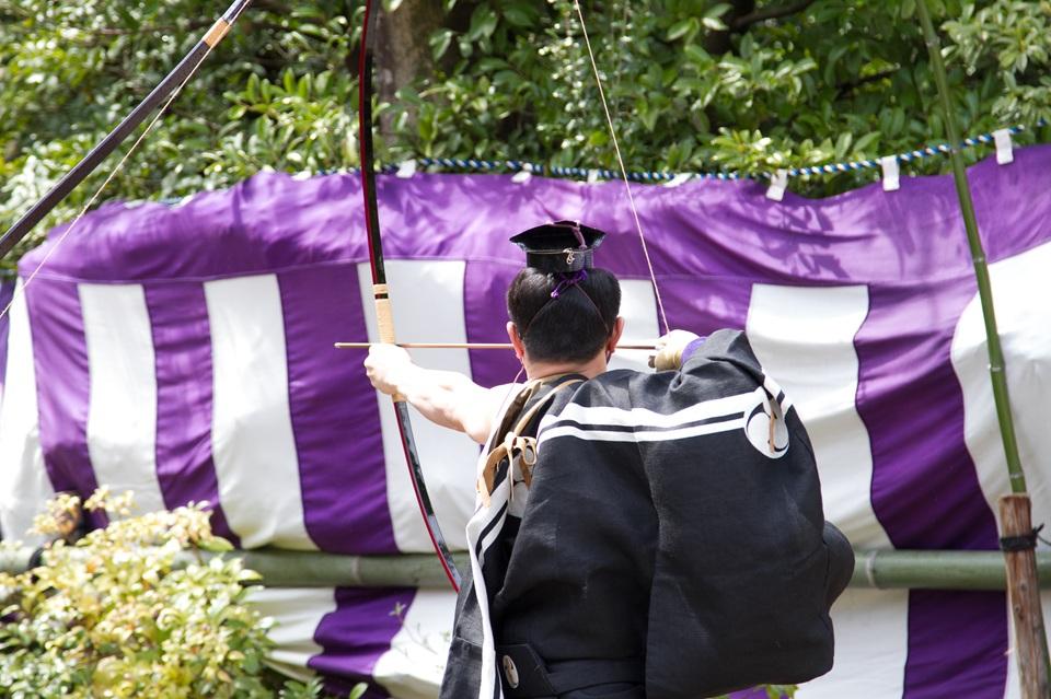 境内に設けられた射場で、6名の弓士が矢を放つ。