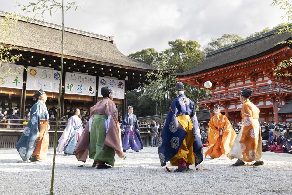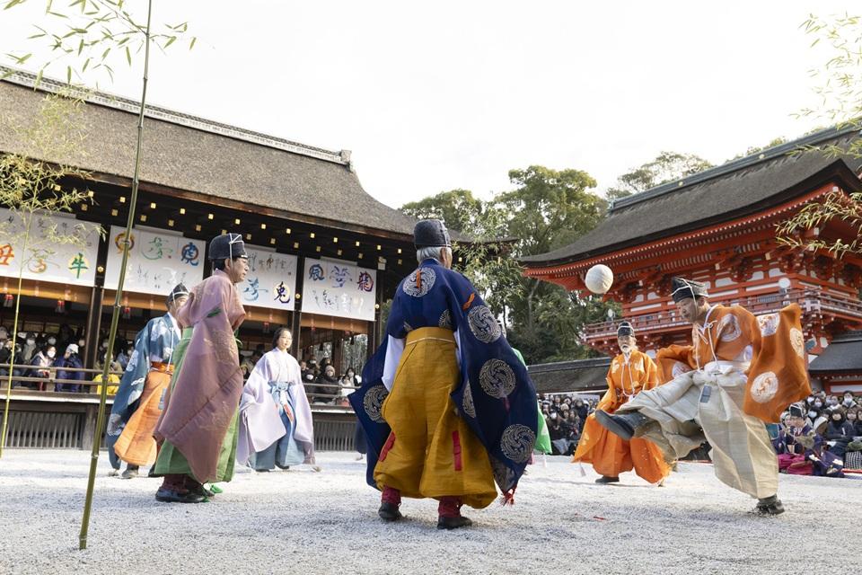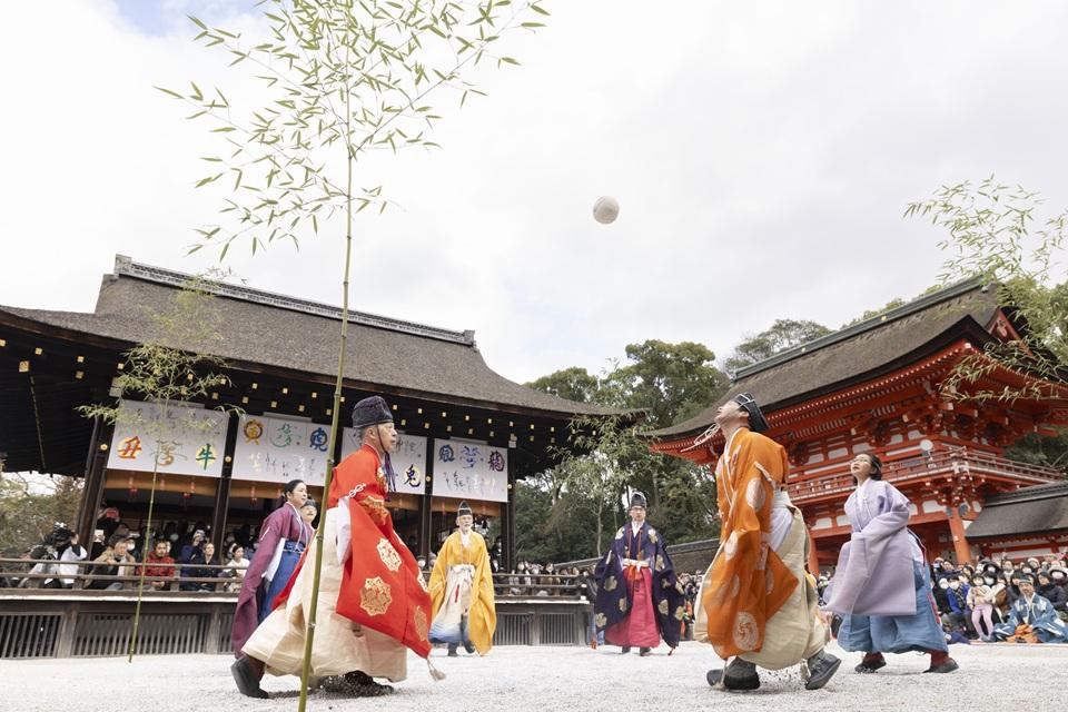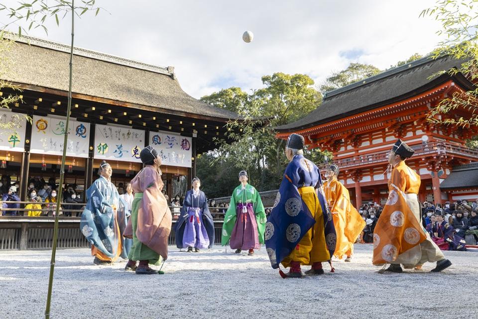 正式には賀茂御祖神社(かもみおやじんじゃ)と呼び、京都で最古の神社のひとつ。世界遺産に登録されている。毎年1月4日には、奈良時代に中国から伝来し、宮中でも愛された伝統行事「蹴鞠(けまり)」が奉納される。蹴鞠は6名から8名が一座となって、鹿皮でできた鞠を、相手が受けやすいように優雅に蹴り続ける平安貴族の優雅な遊びで、飛鳥井流、難波流などの流派がある。水干(すいかん)に烏帽子姿の蹴鞠保存会メンバーが再現する姿やその足さばきを一目見ようと、たくさんの見学者が訪れる。有料の特別拝観席は正午からの受付。基本情報
