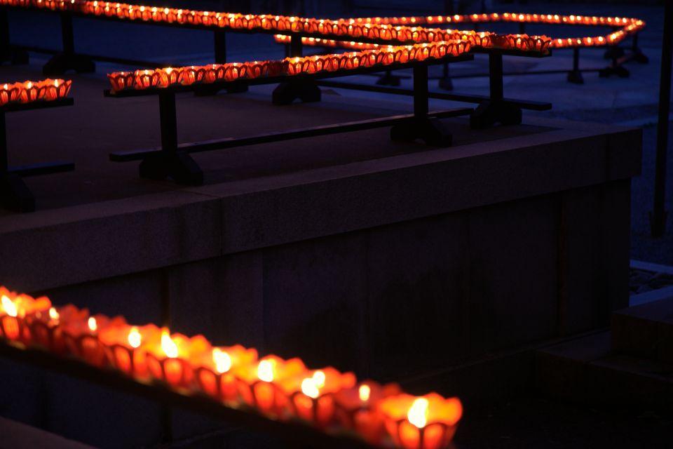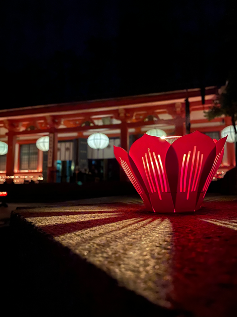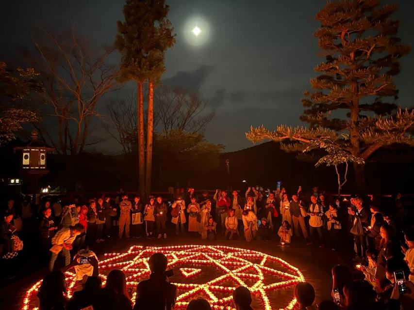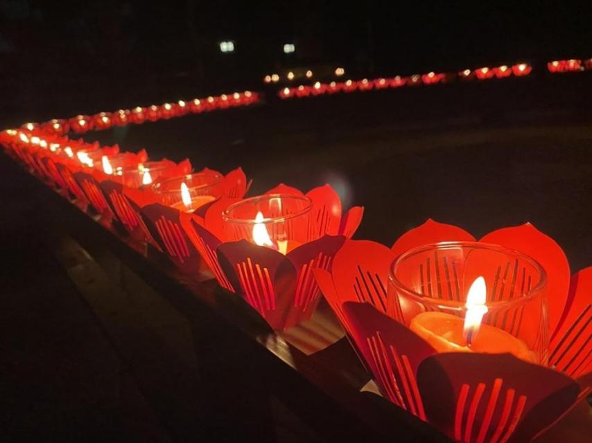 暗闇の中、参加者が手にする灯明がいっせいに捧げられる光景は幻想的。