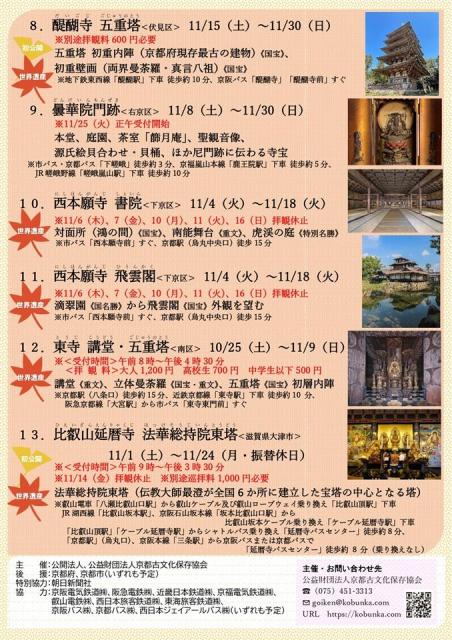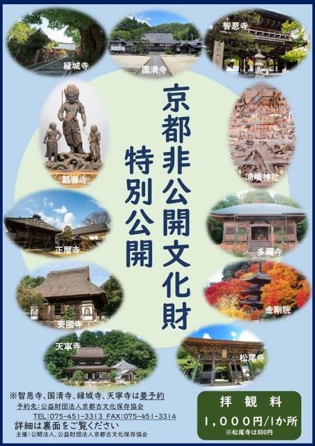 普段は見ることができない神社や寺院等の貴重な文化財が、京都古文化保存協会により、春と秋の一定期間、特別に公開される。※拝観料は文化財の保存修理・維持管理等に役立てられます。10/25(土)~11/9(日)