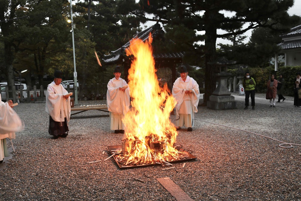 「大祓の詞」が唱和される中、数千本の火焚串が焚き上げられる 毎年11月20日に行われる火焚祭では、参拝者の願いが記された数千本に及ぶ火焚串を忌火で焚き上げ、参列者全員で「大祓の詞」を唱えて無病息災、家内安全を祈願する。優雅な「浦安の舞」の奉納もある。 ![]() |