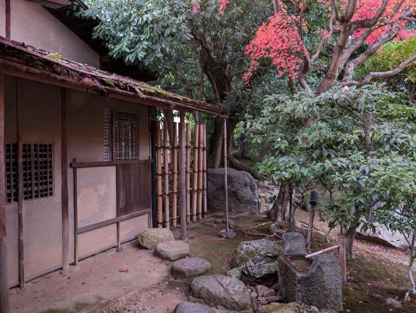 この北庭の端に位置する小間の茶席で、小堀遠州公から代々小堀家に受け継がれてきた武家茶道「小堀遠州流」の御点前にて、濃茶を一服差し上げます。
