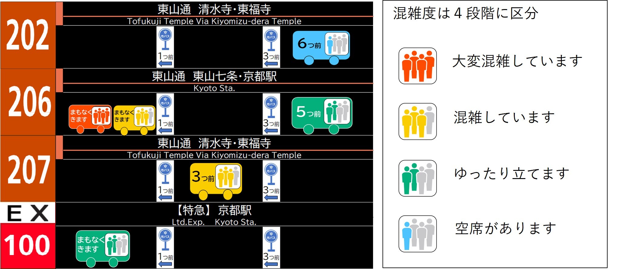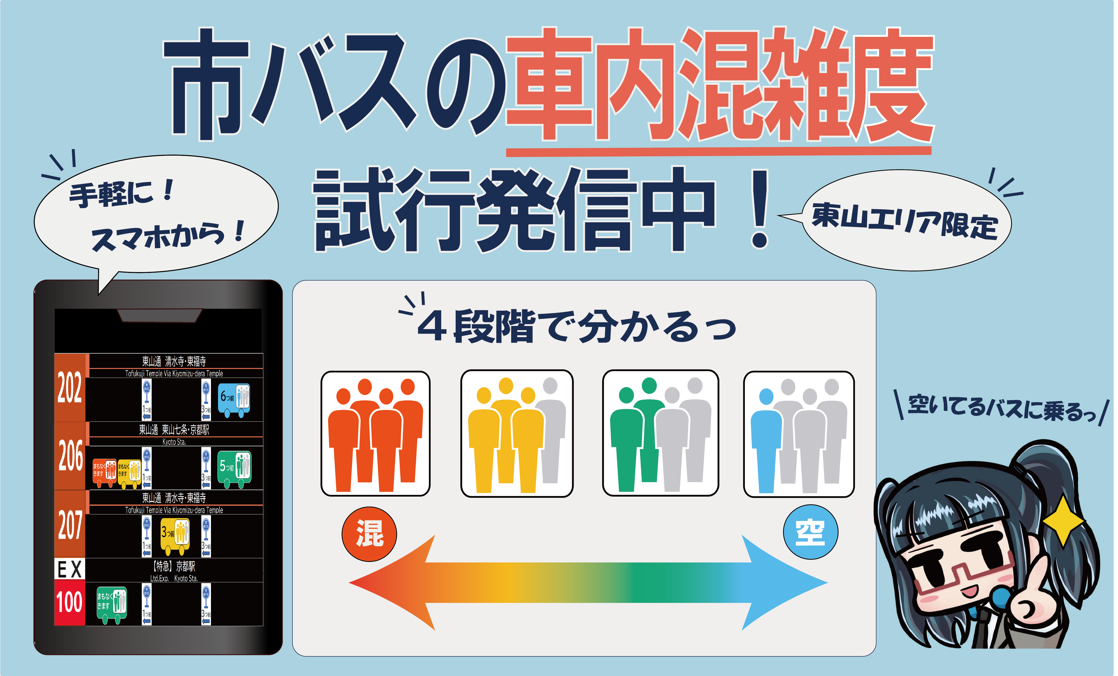 市バスの車内混雑度や走行位置等のリアルタイム運行情報(※)について、秋の観光シーズンに東山エリアの一部停留所を対象に試行的に発信します。スマートフォン等で市バスの車内混雑度を確認いただけます。空いているバスや他のルートを選択し、快適に移動しましょう。