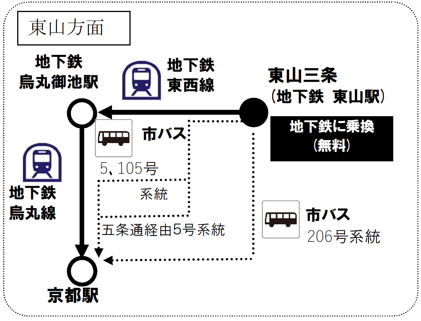 混雑を避けスムーズにご移動いただくには、地下鉄などの「電車」と「バス」を組み合わせたご利用がおすすめです。期間中の土日祝日は、対象の停留所から京都駅に向かわれるお客様にバスから地下鉄への無料振替を実施します。