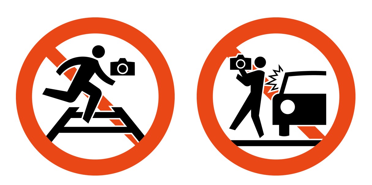 踏切での安全を呼びかけるため、ピクトグラムで注意喚起しています。
