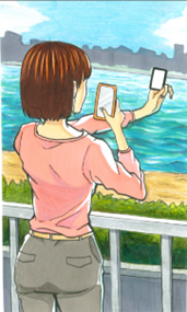 クリアカードを川の風景にかざしてスマートフォンで撮影すると、あなただけの特別な一枚が完成します。