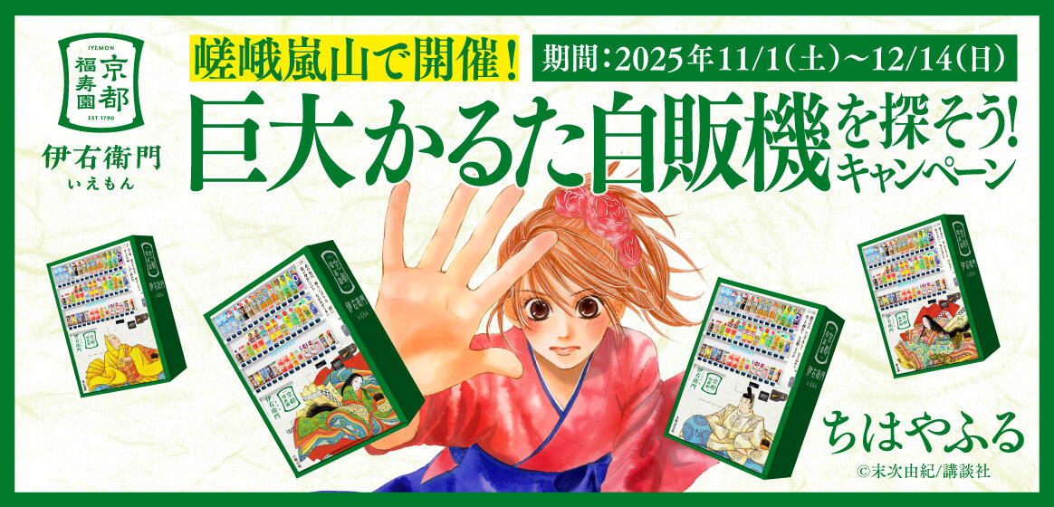 サントリー緑茶「伊右衛門」と京都市がコラボし、嵯峨嵐山エリアをはじめ市内各地に設置された巨大かるた自販機を対象にしたキャンペーンを実施します。