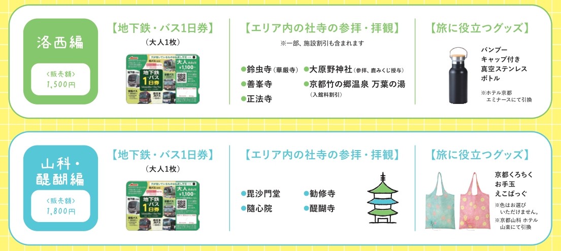 「地下鉄・バス1日券」と社寺の参拝・拝観や旅に役立つグッズをセットにした「乗るほどお得!秋の社寺めぐりパスポート」2種類を、期間限定で販売。洛西エリアと山科・醍醐エリアを、気軽に、おトクに周遊していただけます。本キャンペーンは、JR東海の「そうだ 京都、行こう。」と連携して実施します。