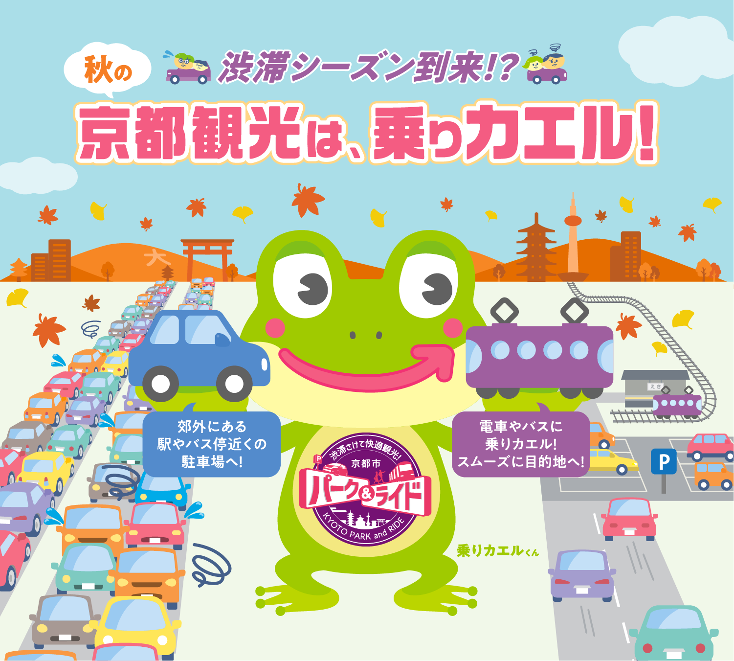 京都市では市内中心部や観光地周辺の渋滞緩和等を目的に、車から公共交通に乗り換えて目的地に向かう「パークアンドライド」の取組を進めています。