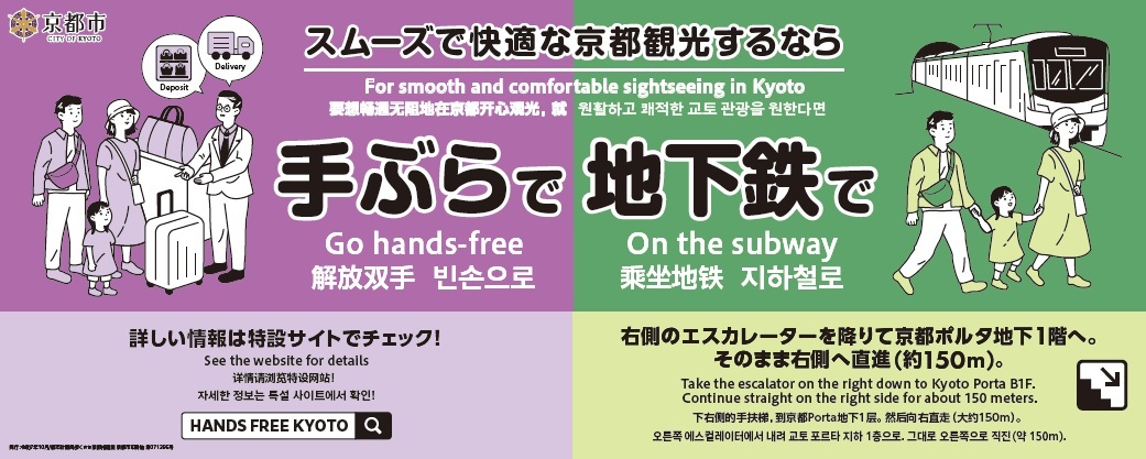 地下鉄京都駅・烏丸御池駅、京都ポルタ、JR西日本等の駅構内のデジタルサイネージ、京都駅前バスのりばの大型モニター式バス案内表示器で、「MIND YOUR MANNERS」や「京都『手ぶら観光』のススメ」等のメッセージを表示し、観光マナーを呼びかけています。