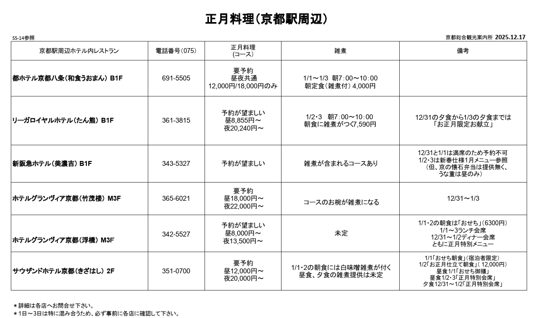 旅行や帰省でお正月に京都に来られた際には、京都らしいおせち料理や雑煮を味わってみるのはいかがでしょうか?京都駅周辺でおせち料理や雑煮が食べられるお店や、京都市内で白味噌雑煮を楽しめるお店をご紹介しています。