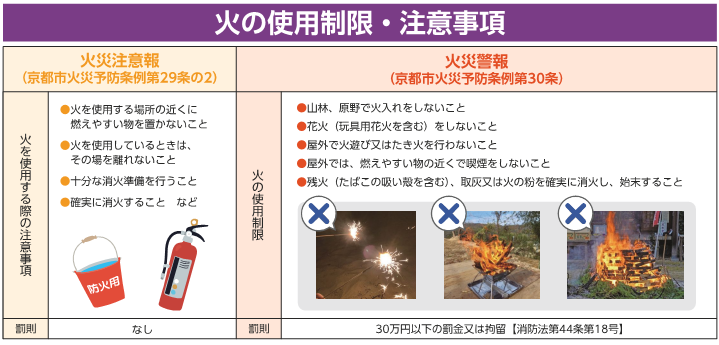 京都市では火災が発生しやすい気象状況となった場合に、「火災注意報」や「火災警報」を発令し、火の使用を控えていただくなど、火災予防の取組を行っています。特に空気が乾燥しているときや、風が強いときは火災が発生しやすくなります。