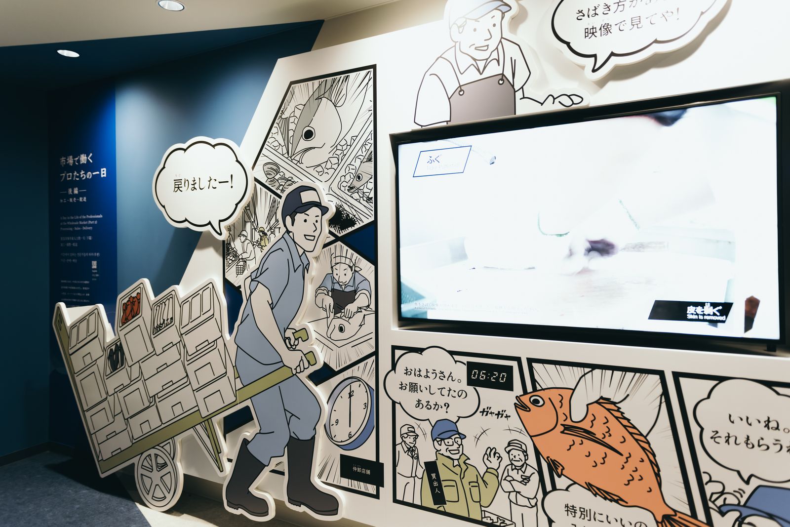 側面に設置された展示パネルや紹介映像では、市場に集まる魚などが私たちの食卓に届くまでの、仕組みや工夫、歴史がわかりやすく解説されています。