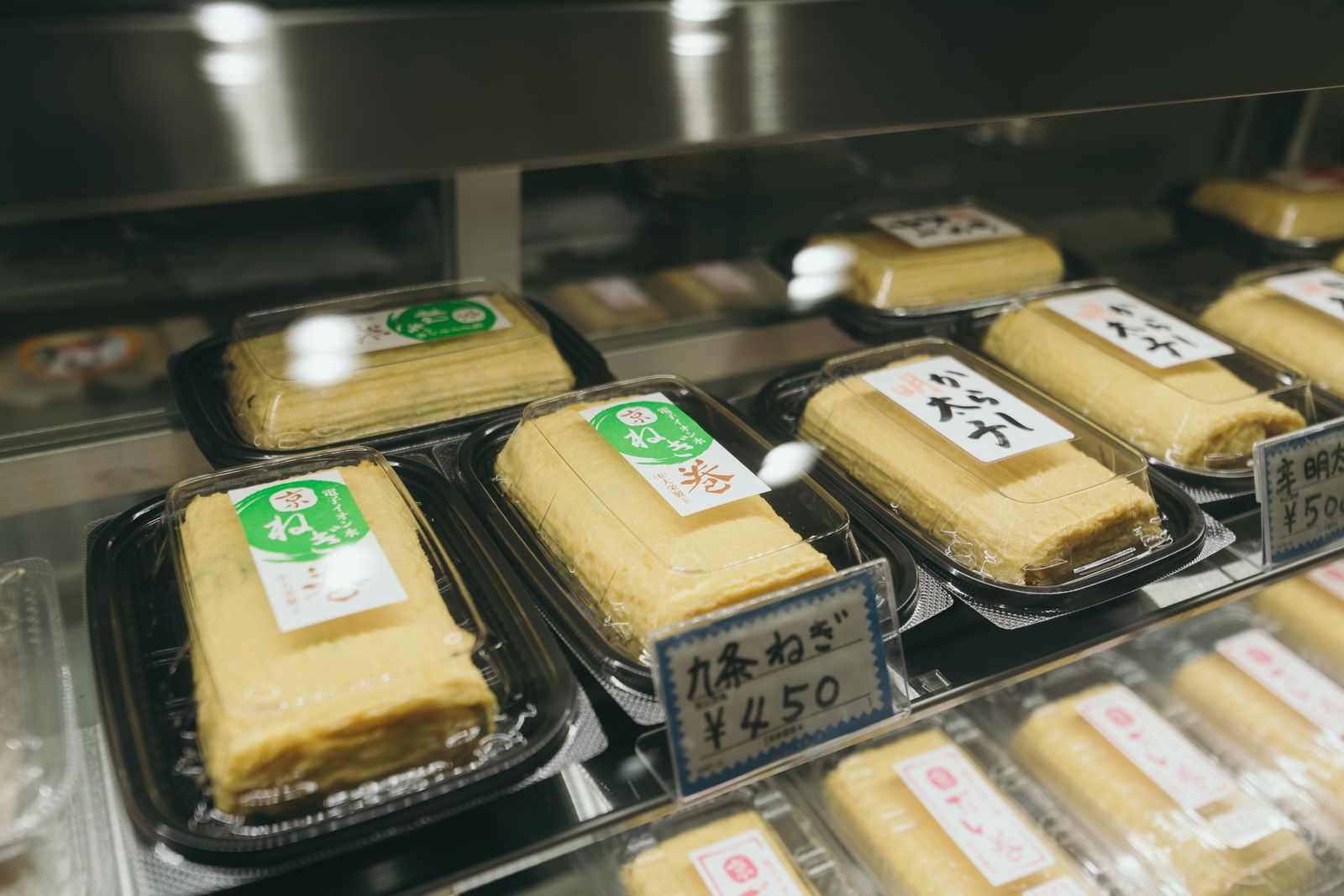 ショーケースには、うつくしい焼き色のだしまきがずらりと並びます。