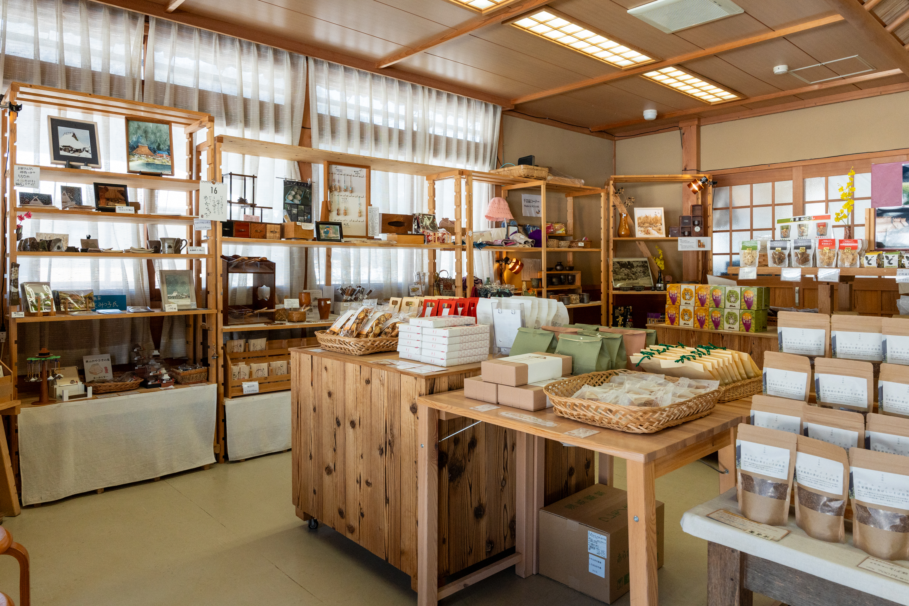 集落の入口にある「お土産処かやの里」では、地元の手仕事が詰まった特産品を手に取ることができます。