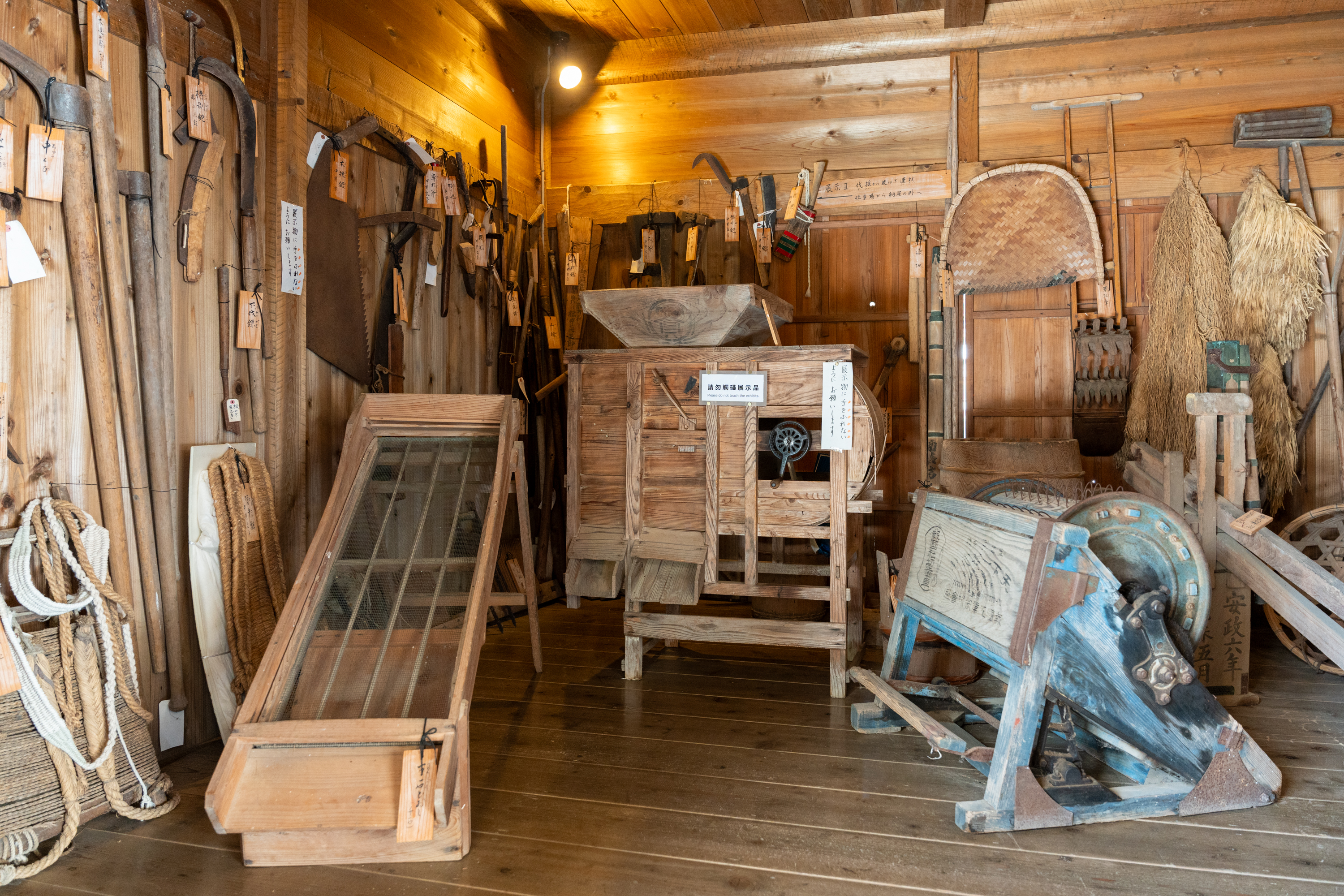集落のなかにある「美山民俗資料館」では、かやぶき屋根の構造や、農具・生活道具など先人の知恵が詰まった展示を見ることができます。
