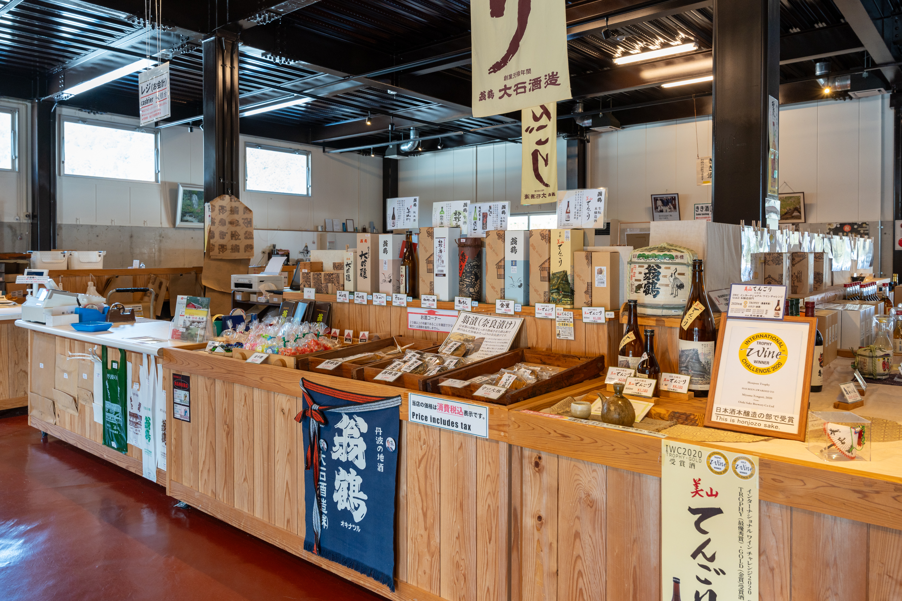 見学のあとはきき酒を楽しみながら、自分へのお土産をじっくり選ぶことができます。日本酒のほか、漬物や醤油など美山ゆかりの厳選品も並び、つい手が伸びてしまいます。