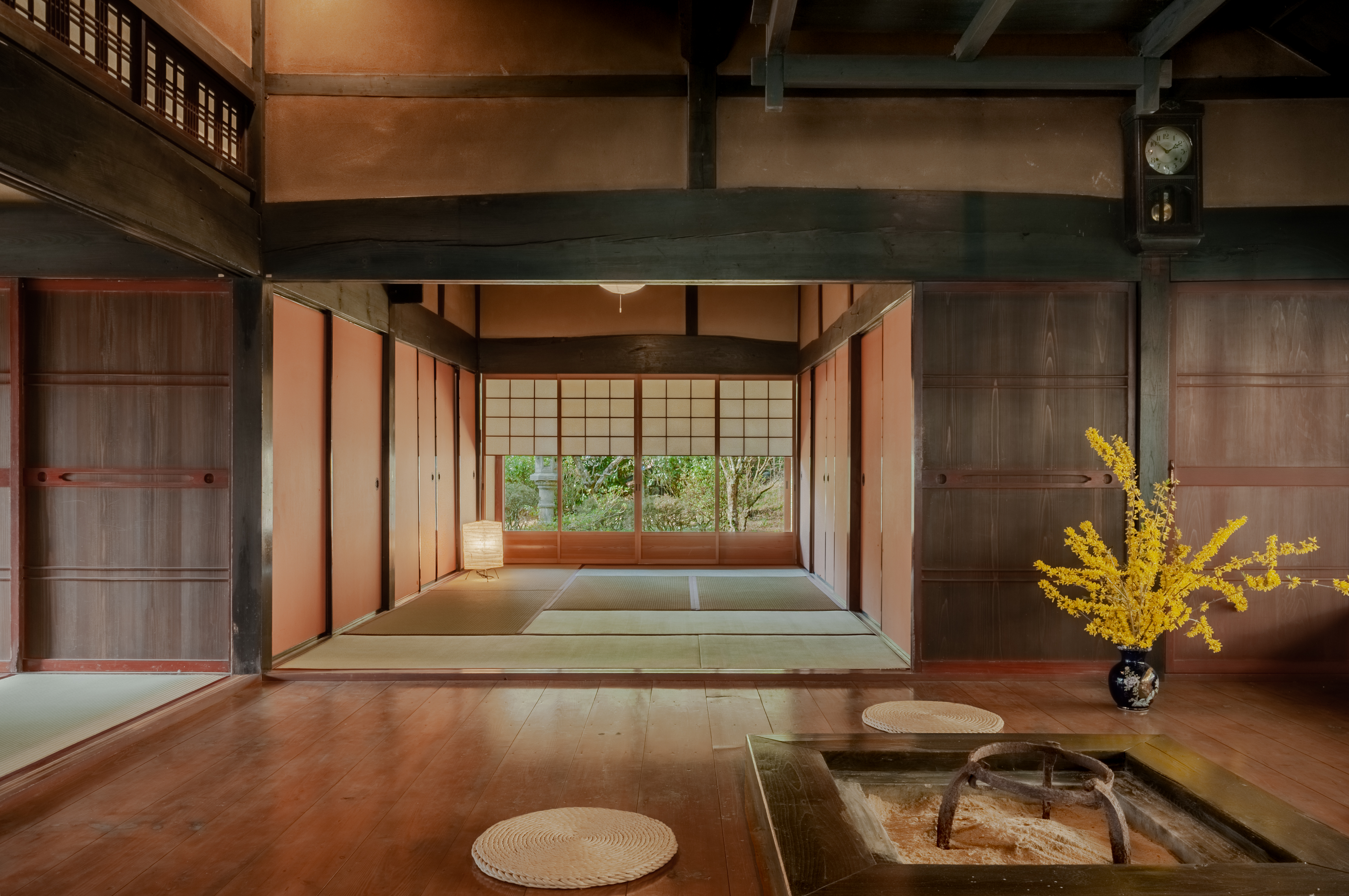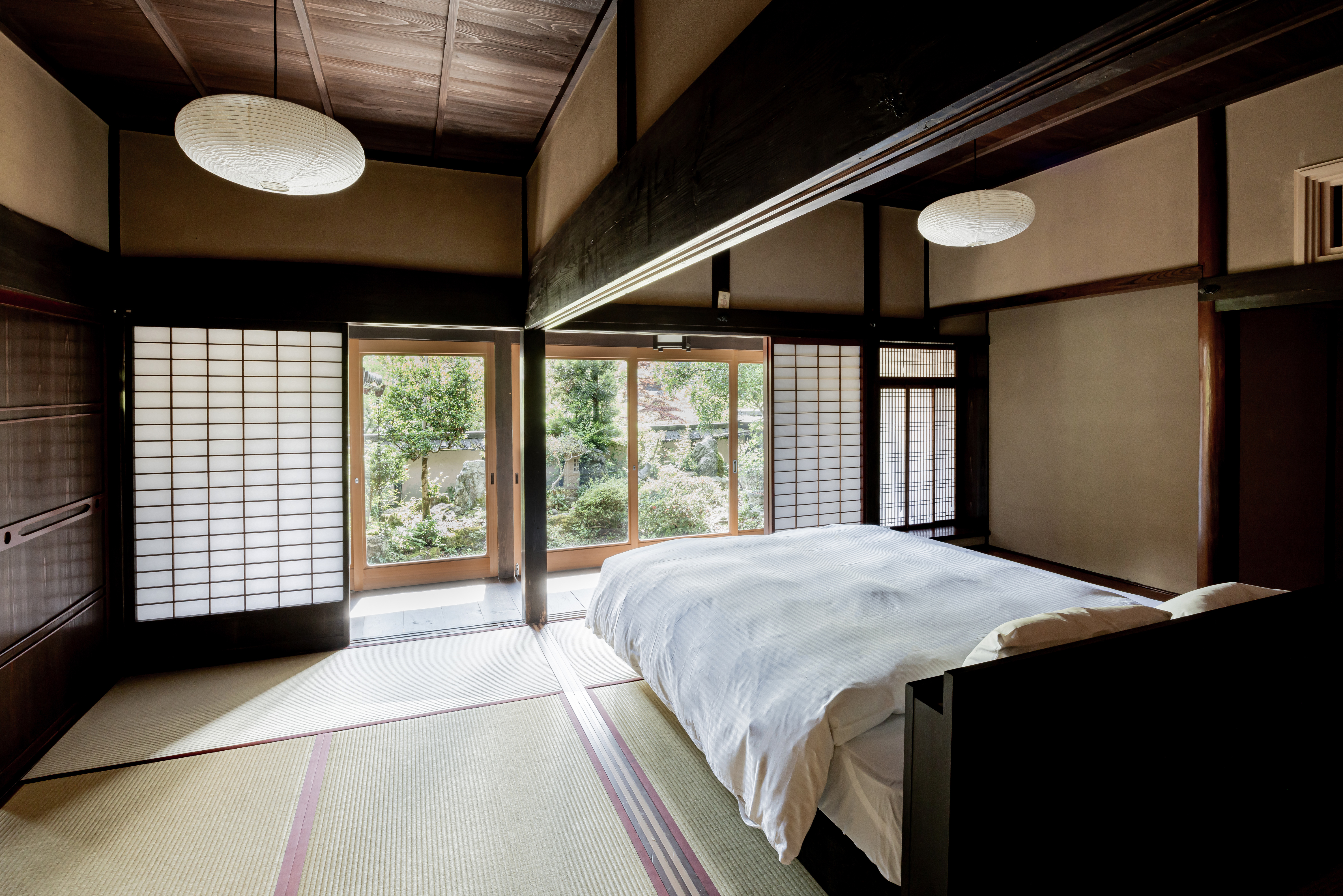 古民家ならではの趣ある寝室で目覚めると、窓の外には庭の緑が目に飛び込んできます。朝の光が差し込む畳の間、縁側から聞こえる鳥のさえずりといった都会では決して出会えない、静かな時間の流れがここにはあります。