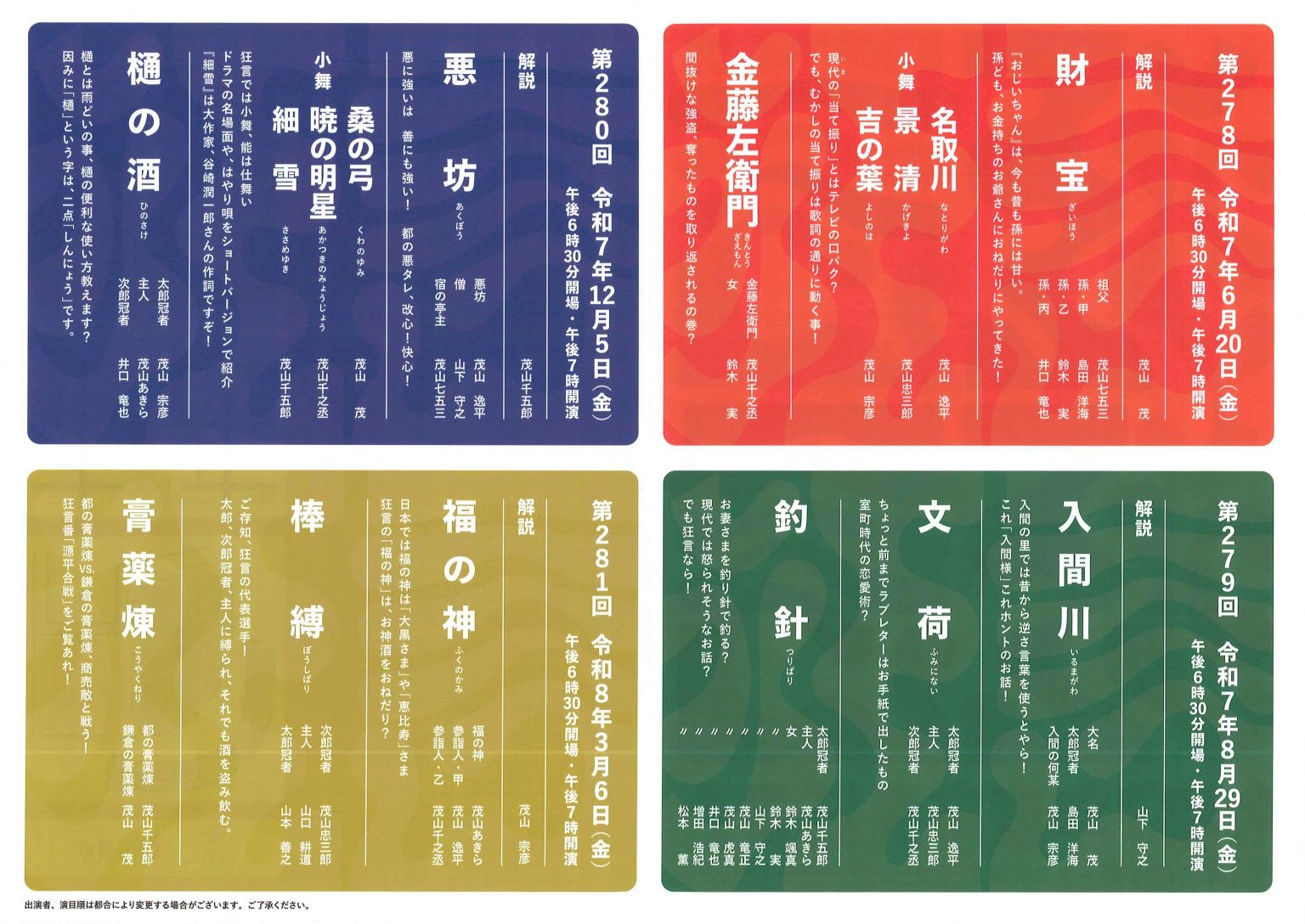大蔵流茂山千五郎家・忠三郎家の協力を得て、1957年にはじまり、今年でなんと67年目!年4回の公演はいずれも金曜日に開催され、夜の開催。仕事帰りにも、京都観光・散策の「締め」にもおすすめの、京都ならではの夜のエンターテインメントです。